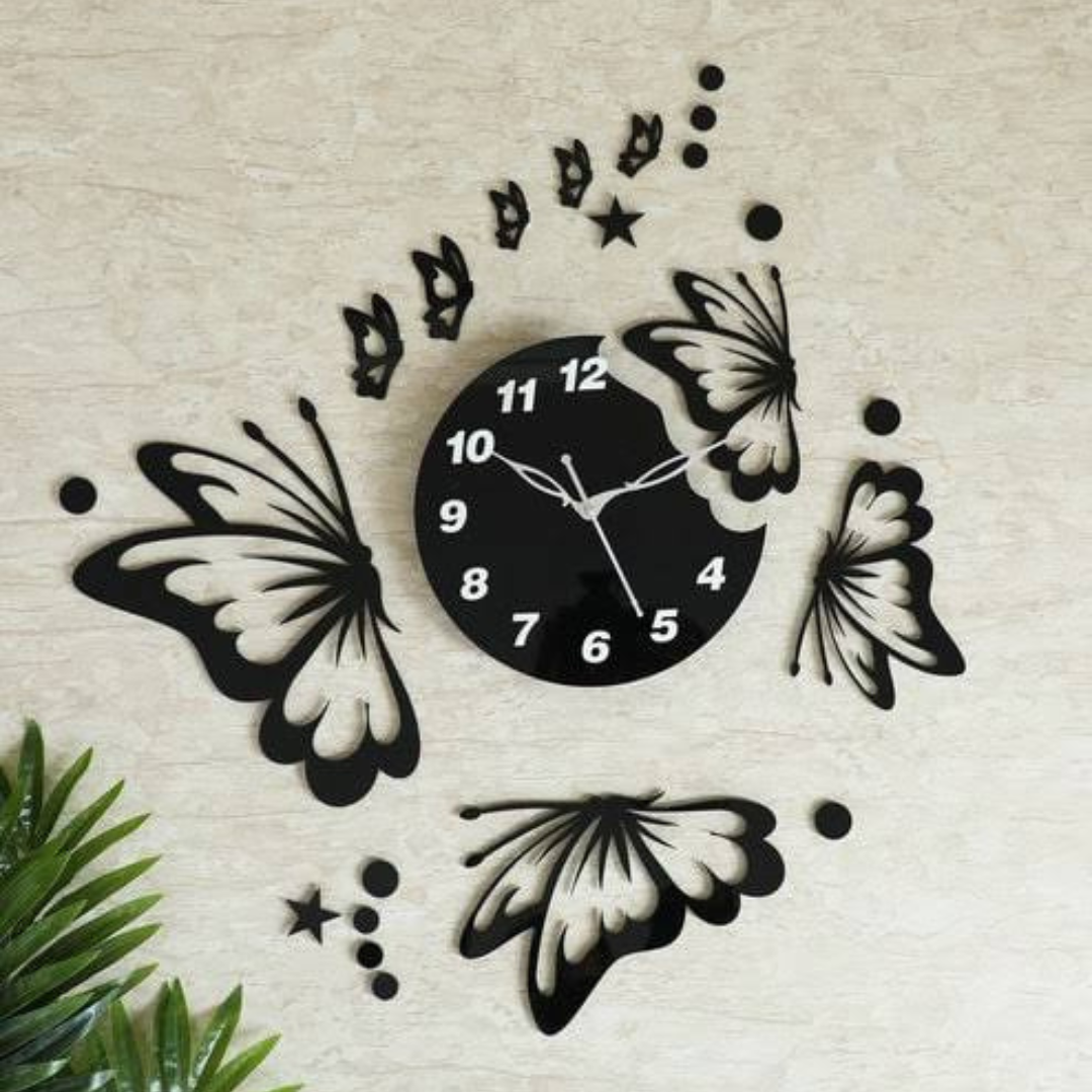 This beautiful wall décor features a stylish round clock surrounded by graceful butterfly designs, creating a sense of movement and elegance. The black and white butterfly accents add a modern, artistic touch that stands out against light-colored walls. Perfect for living rooms, bedrooms, offices, or hallways, this butterfly-themed wall clock blends functionality with decorative charm, bringing a calm and refreshing atmosphere to any interior space.